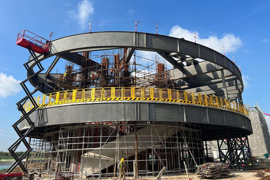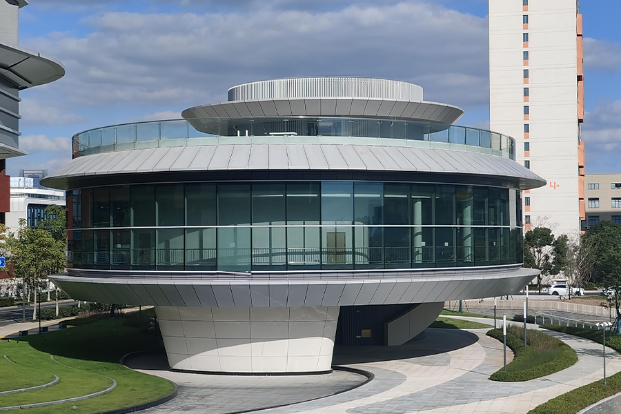 يعتمد هذا المشروع على هيكل إطاري. الأعمدة الفولاذية عبارة عن أعمدة مقواة، والعوارض الفولاذية عبارة عن عوارض فولاذية صلبة على شكل حرف H. تتميز العوارض الفولاذية الخارجية بمقاطع منحنية، مما يفرض متطلبات تصنيع عالية جدًا. مظلة السقف عبارة عن هيكل معلق. وتبلغ الحمولة الإجمالية للهيكل الفولاذي الرئيسي 807 طنًا. تعتمد الجدران الخارجية على نظام جدار ستارة من ألواح الألومنيوم على شكل جرس رياح. يربط هذا النوع من الجدران الستارية ما يقرب من 23000 لوح من الألومنيوم تم تصنيعها كقطع جرس الرياح على التوالي من خلال كابلات من الفولاذ المقاوم للصدأ أو أعمدة معدنية، مثبتة على جانب واحد فقط لتقييد الحركة في اتجاه واحد. قد يكون ترتيب الألواح التي تعمل بالرياح متداخلًا أو متباعدًا. في الترتيب المتداخل، تصطدم ألواح جرس الرياح مع بعضها البعض في مهب الريح، مما ينتج صوتًا واضحًا؛ ويبدو الترتيب المتباعد أخف وزنًا، مع تأثير بصري متدفق أكثر وضوحًا.